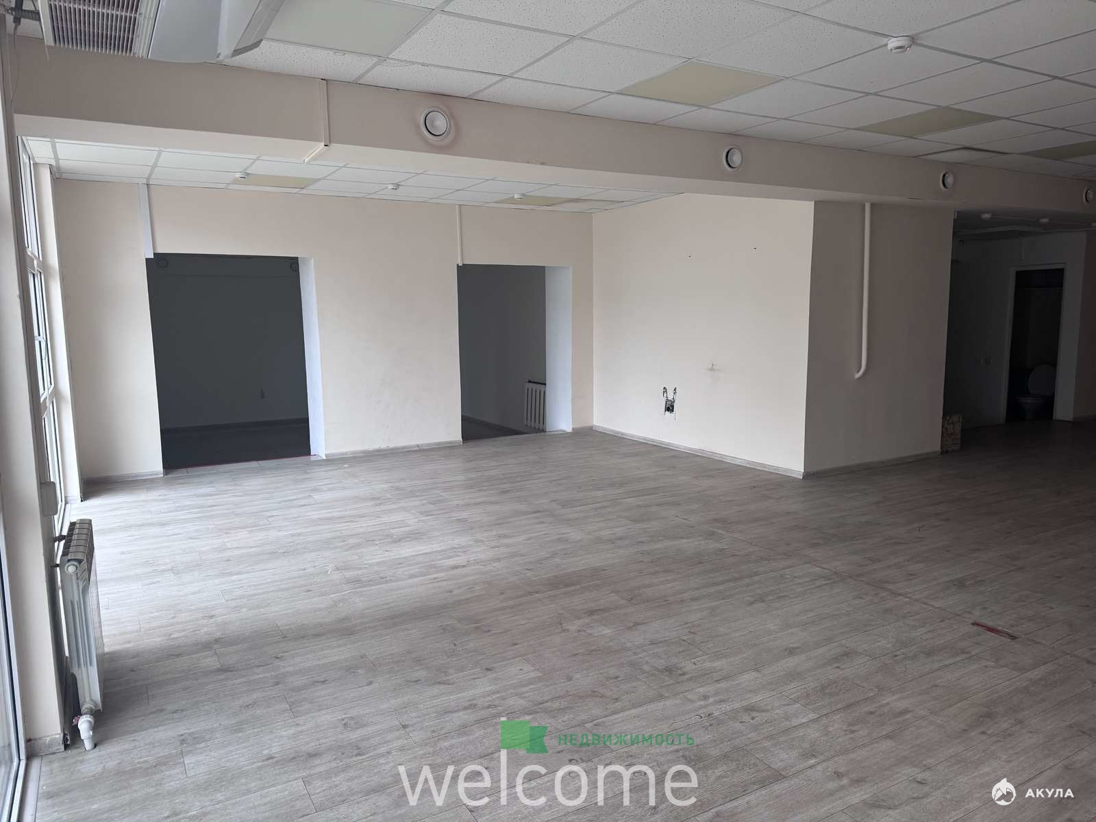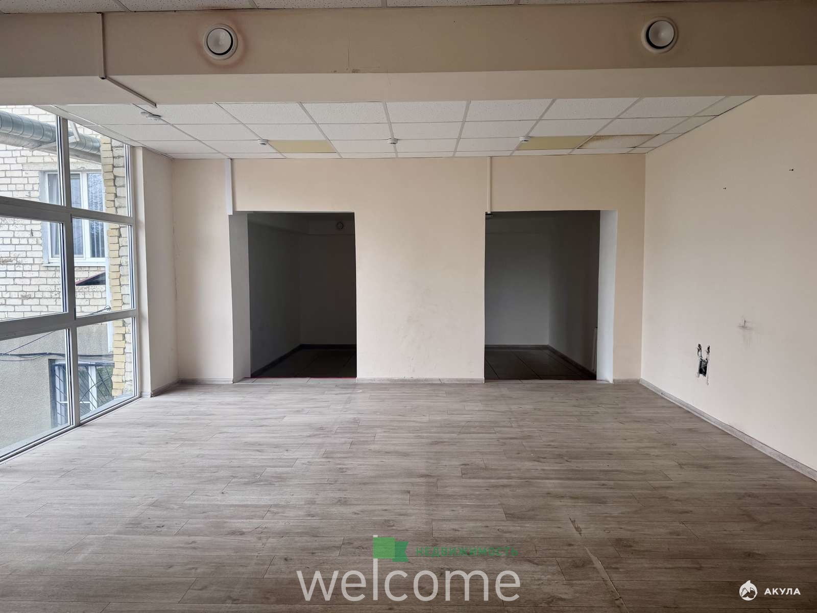 Окна на две стороны. Одно окно у входа, еще два панорамных окна с другой стороны помещения.