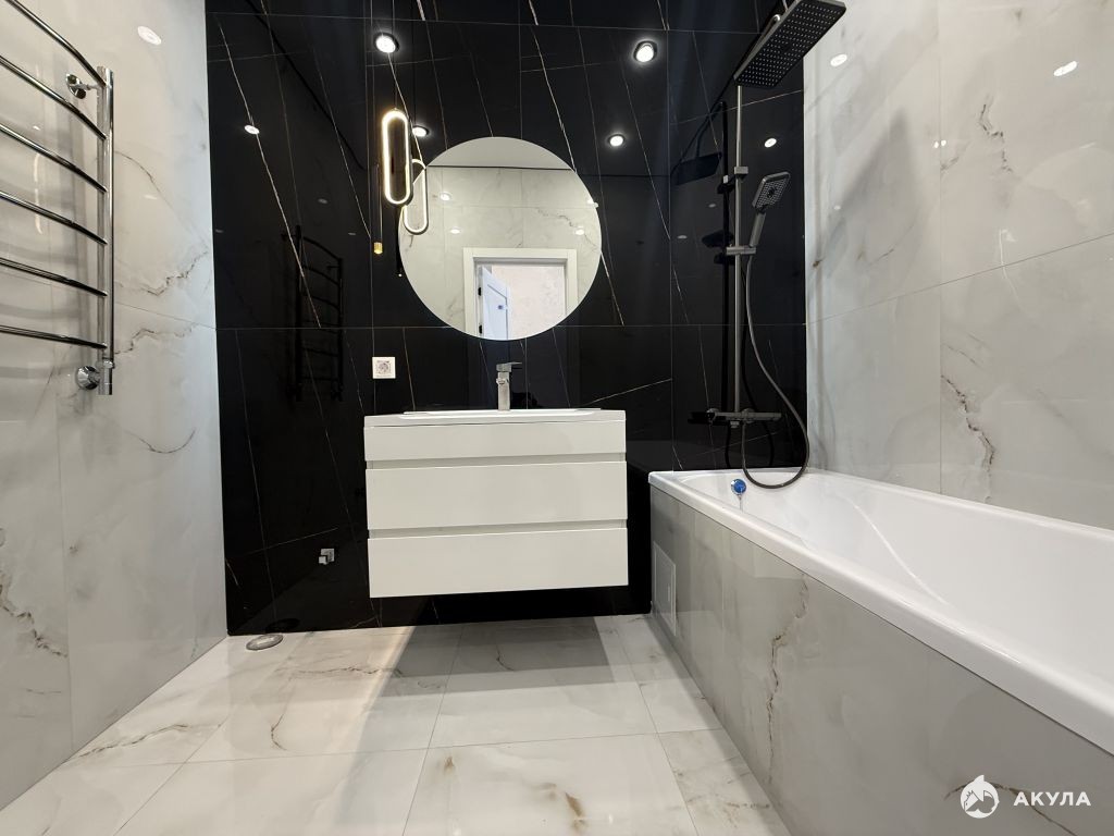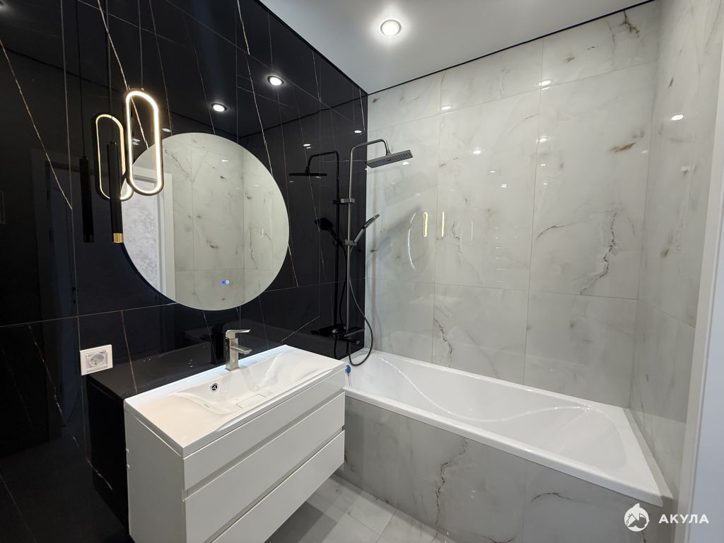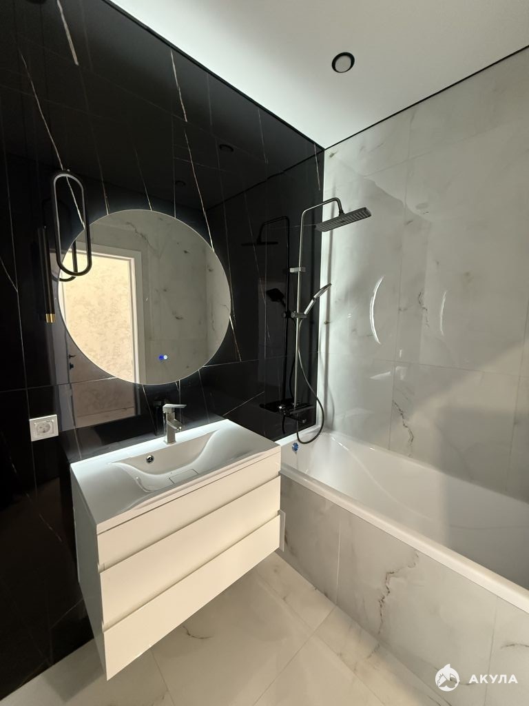 Кухня оборудована современной встроенной техникой и стильной мебелью. Ванная комната выполнена в современном стиле с качественной сантехникой и плиткой.